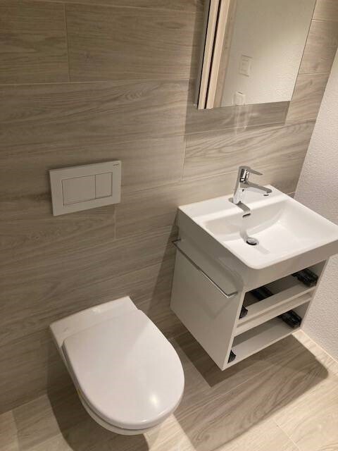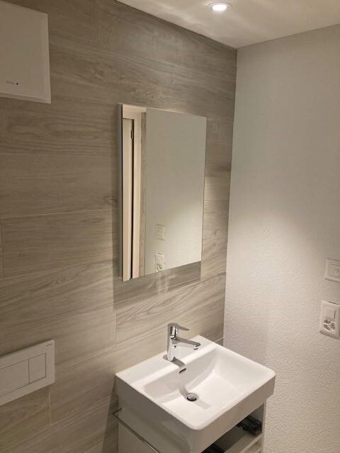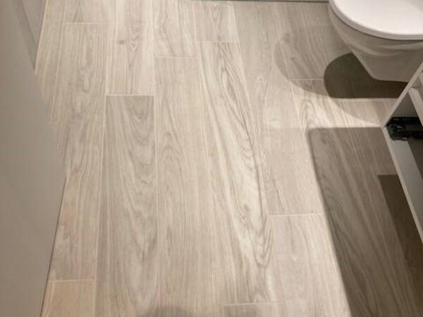Verlegung der Wand- und Bodenbeläge in den Nasszellen sowie Verlegung der Bodenplatten im Treppenhaus.